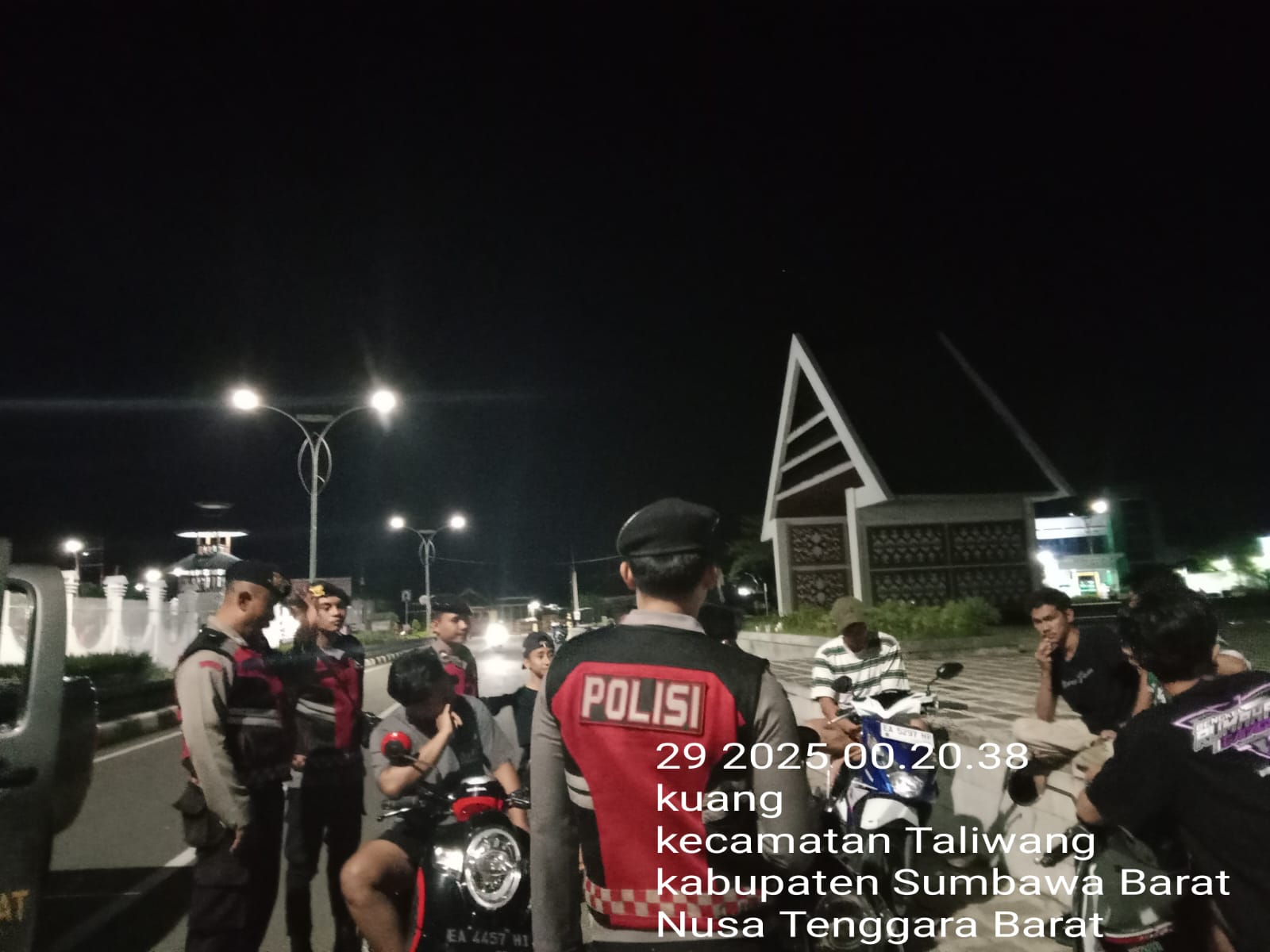 Selama patroli, petugas Polres Sumbawa Barat bertemu dengan sekelompok remaja yang sedang berada di taman kota. Dalam kesempatan tersebut, anggota patroli melakukan dialog dengan para remaja yang begadang, selain dialog petugas juga melakukan pemeriksaan badan dan kendaraan untuk mengantisipasi para remaja membawa senjata tajam (sajam) maupun benda lain seperti minunan keras, narkoba dan lain – lain, serta memberikan imbauan terkait larangan mengonsumsi minuman keras (miras), narkoba, dan sejenisnya.