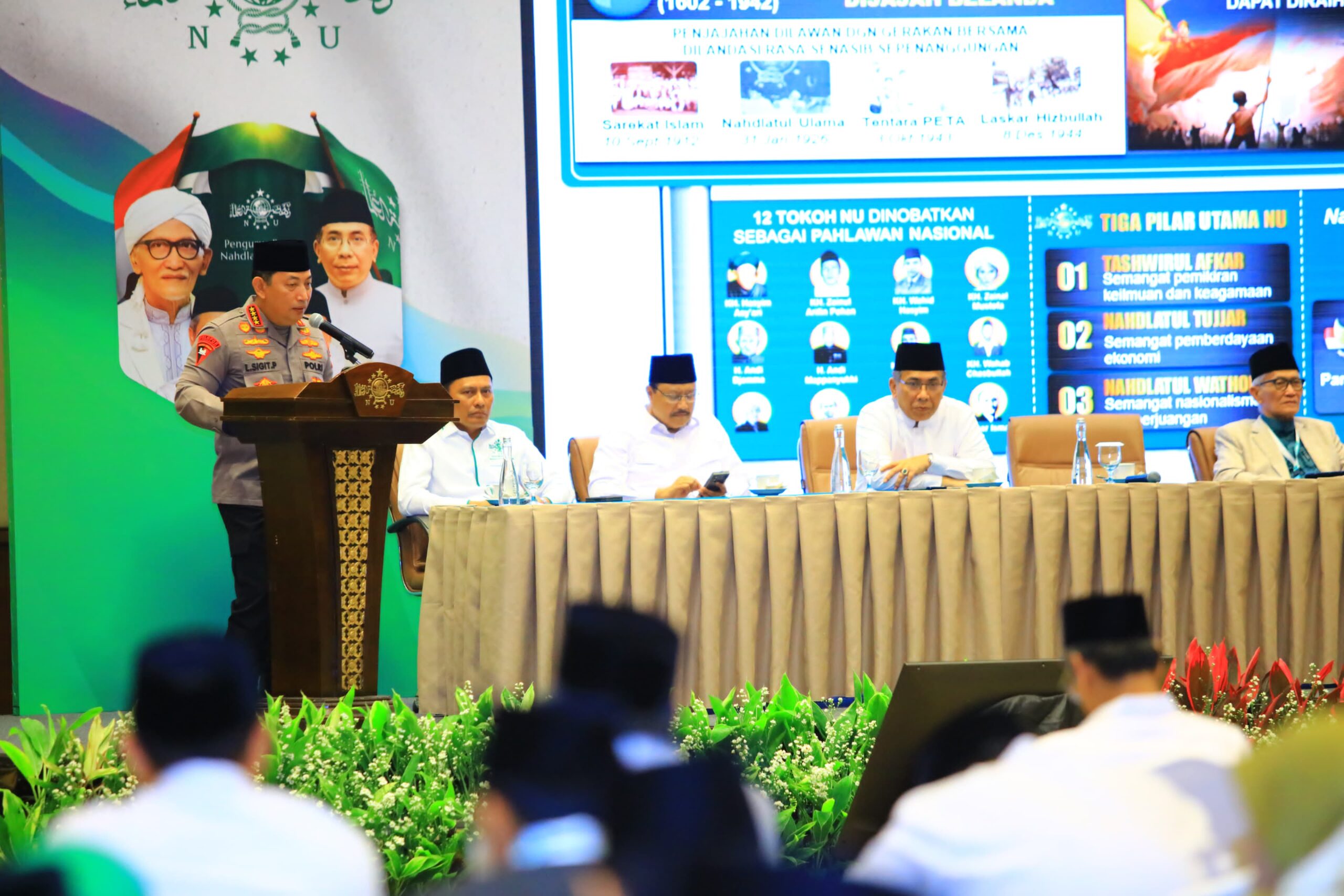 Jakarta. Kapolri Jenderal Polisi Drs. Listyo Sigit Prabowo menjadi Keynote Speech pada acara Munas Alim Ulama dan Konbes NU tahun 2025 di Hotel Sultan, Jakarta. Turut mendampingi Kapolri, Kabaintelkam, Kadivhumas, Kadivpropam, dan Wakabareskrim.