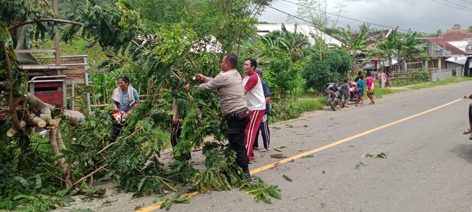 Berkat kerja sama masyarakat dan Polsek Poto Tano, pohon tumbang di jalan raya maupun yang menimpa rumah warga dapat dibersihkan sehingga warga yang terkena musibah terbantu dalam pembersihan.