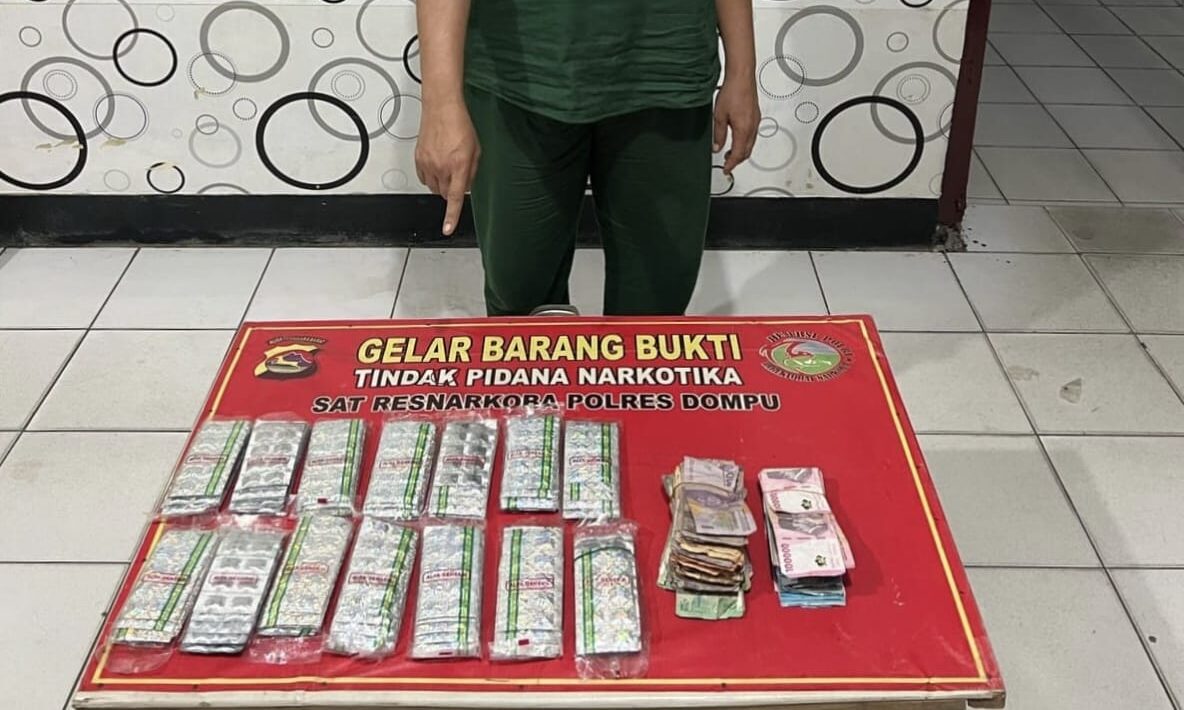 Seorang ibu rumah tangga berinisial ST (50) diciduk Tim Opsnal Satresnarkoba Polres Dompu karena diduga mengedarkan obat keras jenis tramadol tanpa izin. Dari tangan tersangka, polisi mengamankan 1.390 butir pil tramadol dan uang tunai Rp 8.060.000, yang diduga hasil penjualan obat ilegal tersebut.