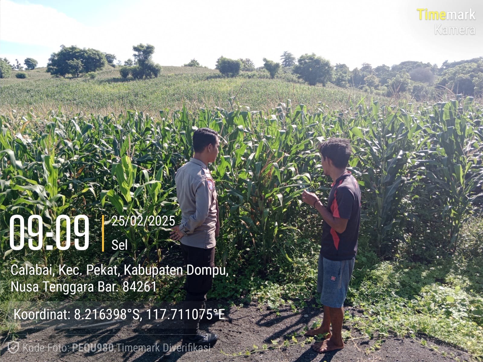 Dalam rangka mendukung Program Ketahanan Pangan Nasional Menuju Indonesia Emas 2024, Bhabinkamtibmas Desa Calabai, Polsek Pekat, Brigpol Imran, melakukan pemantauan lahan pertanian di Dusun Tente, Desa Calabai, Kecamatan Pekat, Kabupaten Dompu, pada Selasa (25/2/2025) pukul 09.09 WITA.