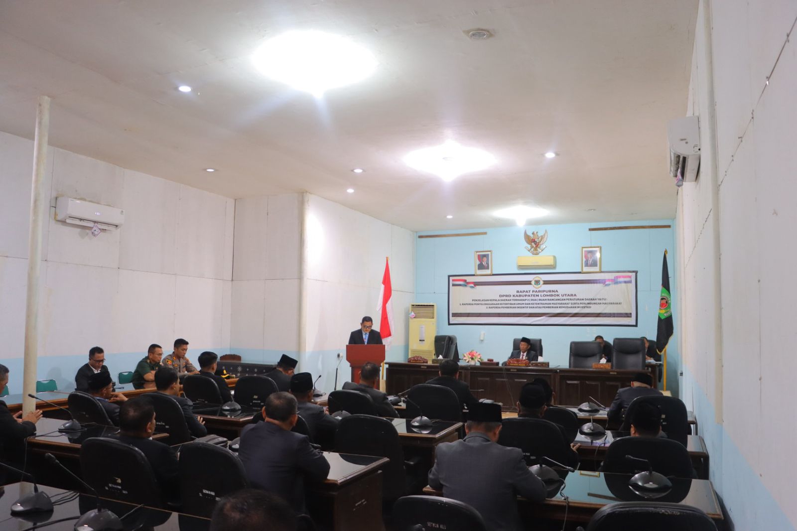 Rapat Paripurna yang dibuka oleh Wakil Ketua I DPRD Lombok Utara Hakamah itu dihadiri oleh Wakil Bupati Lombok Utara KUSMALAHADI SYAMSURI, S.T., M.T, Kapolres Lombok Utara AKBP AGUS PURWANTA, S.I.K, Dandim 1606 Mataram diwakili Pabung LETKOL INF. NGAKAN MADE MARJANA, S.Pd, Wakil Ketua I DPRD Kab. Lombok Utara HAKAMAH, Pimpinan pejabat vertikal di Kabupaten Lombok Utara, Anggota DPRD Kabupaten Lombok Utara, Kepala OPD Lingkup Pemda KLU dibuka oleh Wakil Ketua I DPRD Lombok Utara Hakamah Penyampaian kepala daerah terhadap 2 buah rancangan peraturan daerah yaitu 1. Raperda penyelenggaraan ketertiban umum dan ketentaraman masyarakat serta perlindungan masyarakat 2. Raperda pemberian insentif dan atau pemberian kemudahan investasi yang disampaikan oleh Wakil Bupati Kab.Lombok Utara Wakil Bupati Lombok Utara Sdr. KUSMALAHADI SYAMSURI, S.T., M.T. sebagai berikut :
