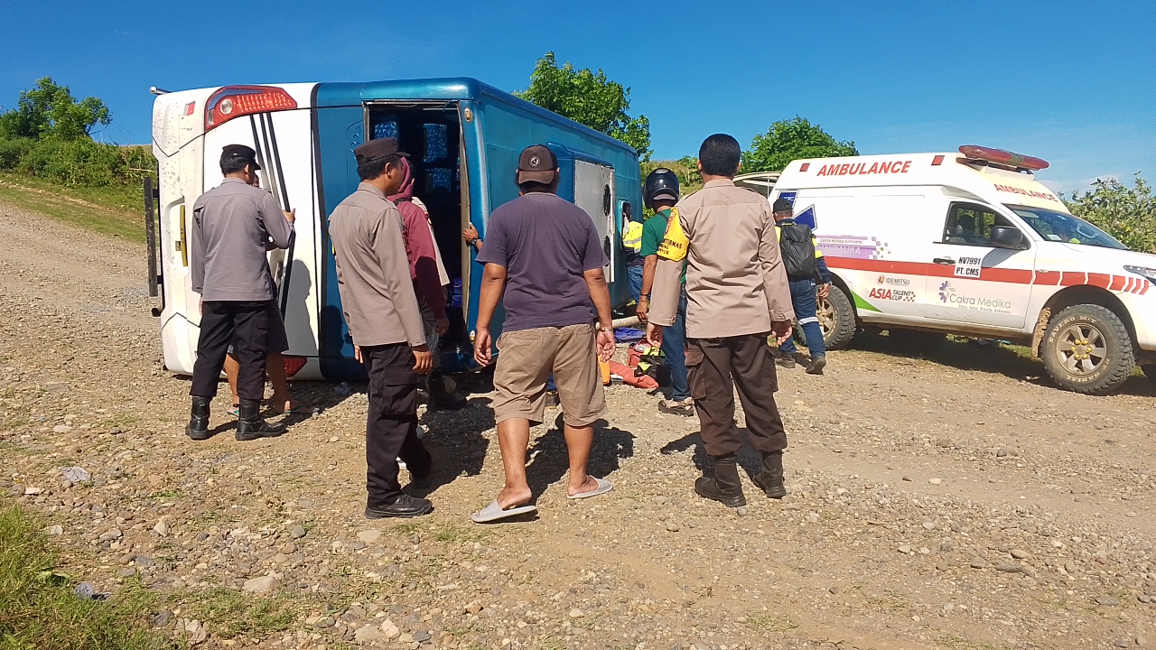 “Saat ini, bus yang terbalik dievakuasi ke Polsek Lunyuk. Sehingga arus lalu lintas di kawasan tersebut bisa kembali lancar,” katanya.