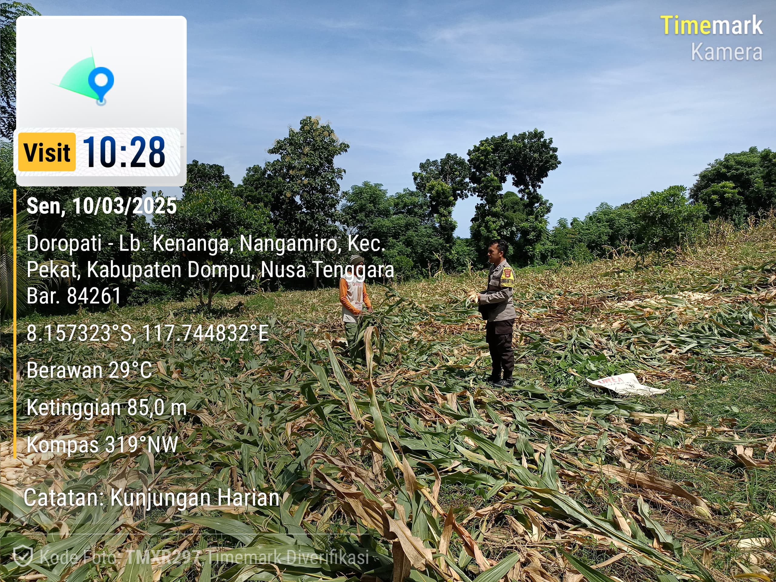Bhabinkamtibmas Desa Nangamiro, Polsek Pekat, Brigadir Lalu Taufik Insani, melaksanakan pemantauan panen raya di lahan milik Hj. Nurma di Dusun Nangamiro, Kecamatan Pekat, Kabupaten Dompu, Senin (10/3/2025). Kegiatan ini merupakan bagian dari Program Ketahanan Pangan Nasional menuju Indonesia Emas 2045.