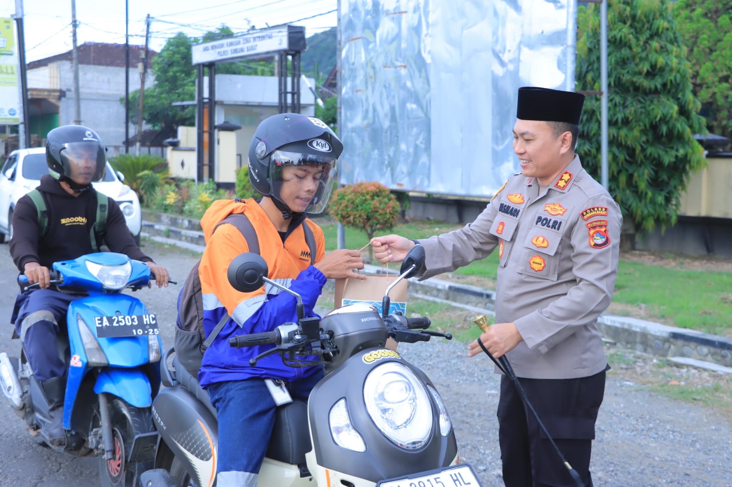 Sumbawa Barat, NTB – Kapolres Sumbawa Barat, AKBP Yasmara Harahap, S.I.K., membagikan takjil untuk berbuka puasa bagi pengguna jalan yang melintas di depan Mapolres Sumbawa Barat Jalan Telaga Bertong Kecamatan Taliwang Kabupaten Sumbawa Barat, pada Selasa (11/03/2025).