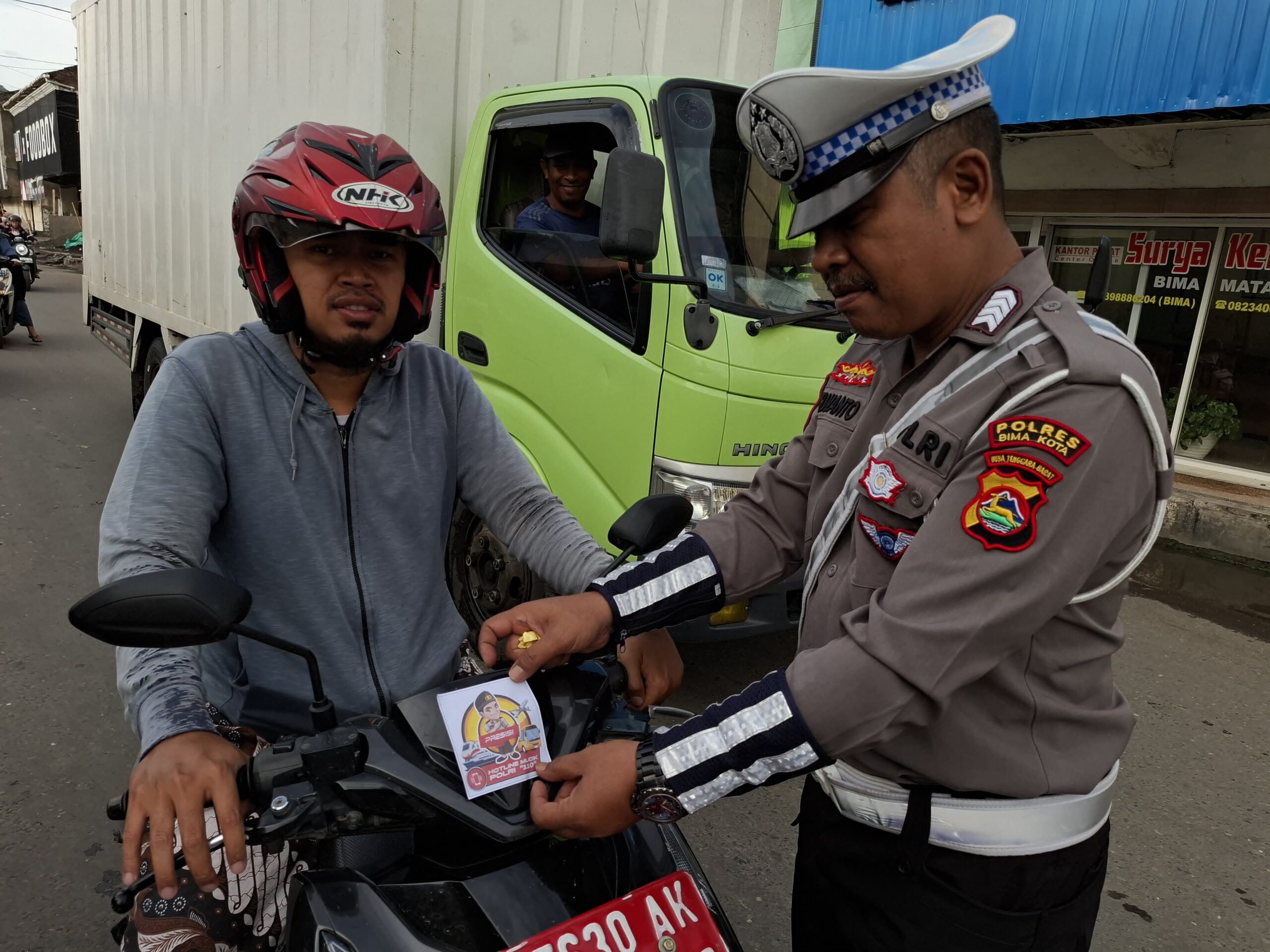 Kota Bima, NTB (23 Maret 2025)) – Satuan Lalu Lintas (Satlantas) Polres Bima Kota menggelar sosialisasi bertajuk “Mudik Aman Keluarga Nyaman” serta memberikan imbauan kepada pengendara roda dua untuk selalu menggunakan helm berstandar SNI dengan klik pengaman. Kegiatan ini berlangsung pada Sabtu (22/3) pukul 09.00 WITA di perempatan lampu merah Pasar Bima, Kelurahan Paruga, Kecamatan Rasanae Barat, Kota Bima.