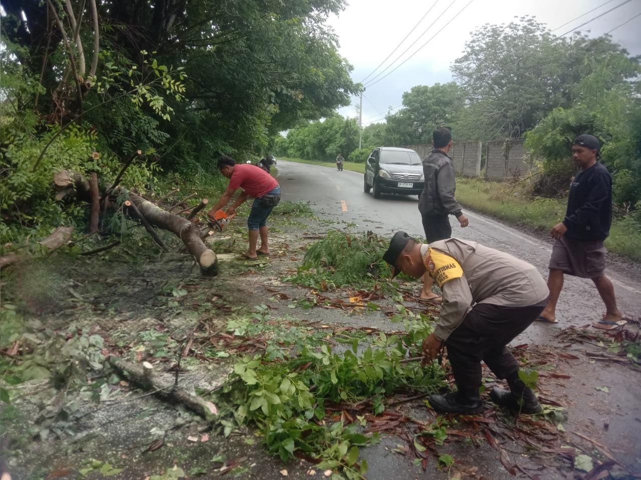 Menanggapi hal tersebut, personel Polsek Rhee bersama masyarakat setempat langsung bergerak cepat. Warga bersama dengan polisi melakukan gotong royong untuk mengevakuasi pohon tumbang tersebut. Setelah beberapa saat bekerja keras, pohon yang menutupi badan jalan berhasil dibersihkan, dan arus lalu lintas kembali normal.