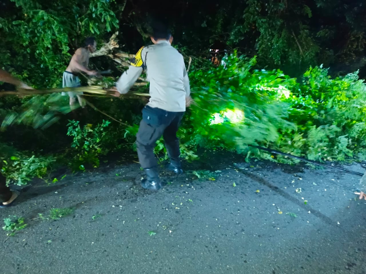 Kapolsek juga menyampaikan bahwa bersama masyarakat, pihaknya juga melakukan evakuasi pohon tumbang yang menghalangi jalan untuk membuka akses kendaraan. “Kami terus melakukan pengaturan arus lalu lintas hingga petugas PLN tiba dan melakukan penanganan lebih lanjut,” ungkap Kapolsek.