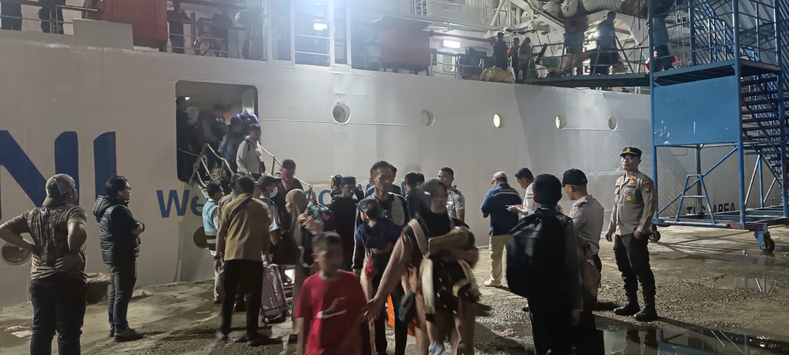 Kota Bima, NTB (27 Maret 2025) – Pos Terpadu Idul Fitri 2025 Pelabuhan Bima melaksanakan pengamanan arus mudik yang menggunakan armada laut kapal KM. Wilis yang tiba di Dermaga Pelabuhan Bima pada Kamis, 27 Maret 2025, pukul 22.15 WITA.