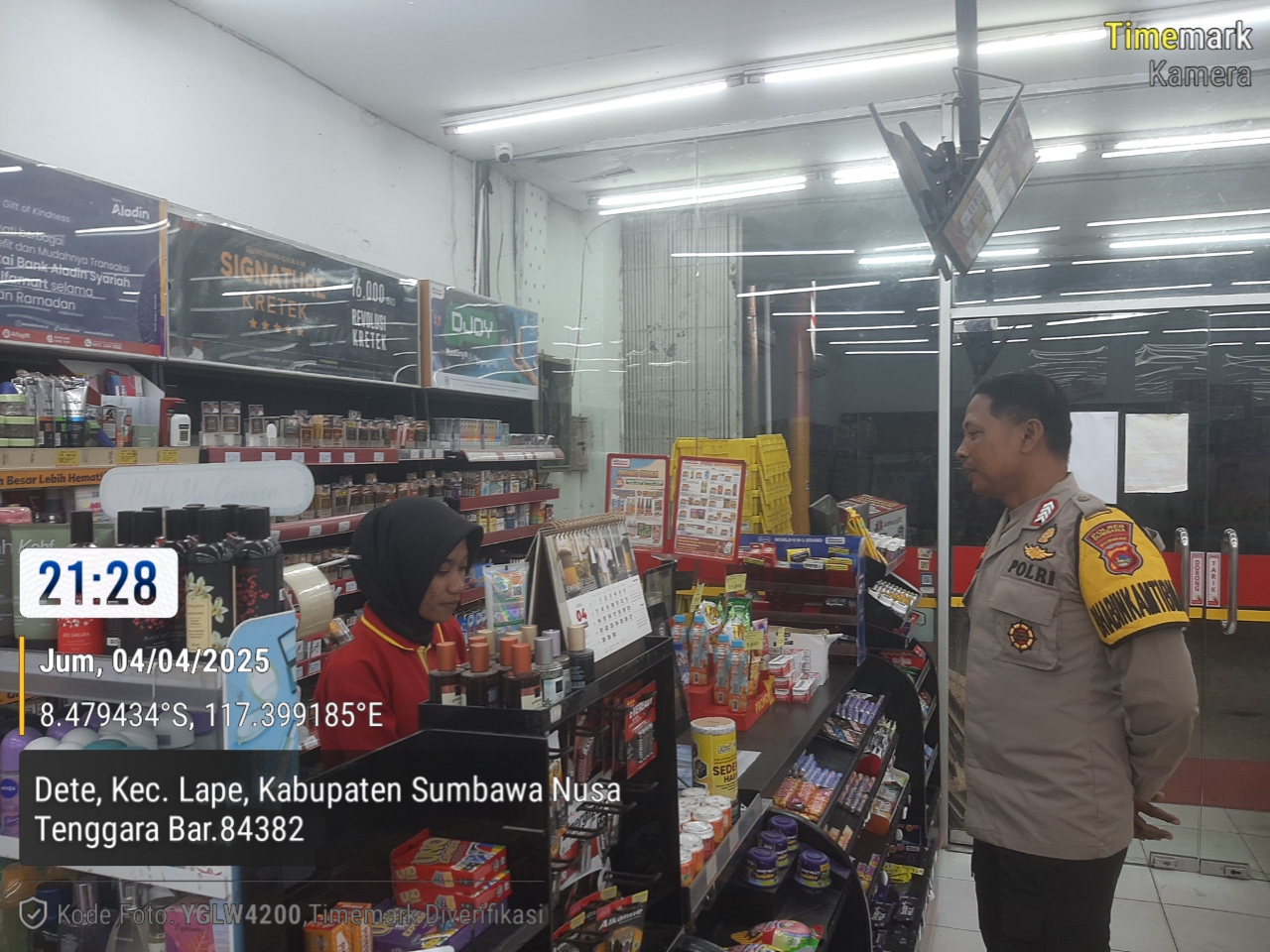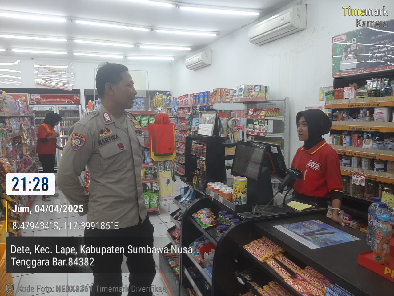 Sumbawa Besar–NTB, Dalam upaya untuk menjaga keamanan dan ketertiban masyarakat, Bhabinkamtibmas Desa Dete, Bripka I Nyoman Kartika, melaksanakan kegiatan sambang ke sejumlah swalayan yang berada di wilayah hukum Polsek Lape, Jumat (04/04/25).