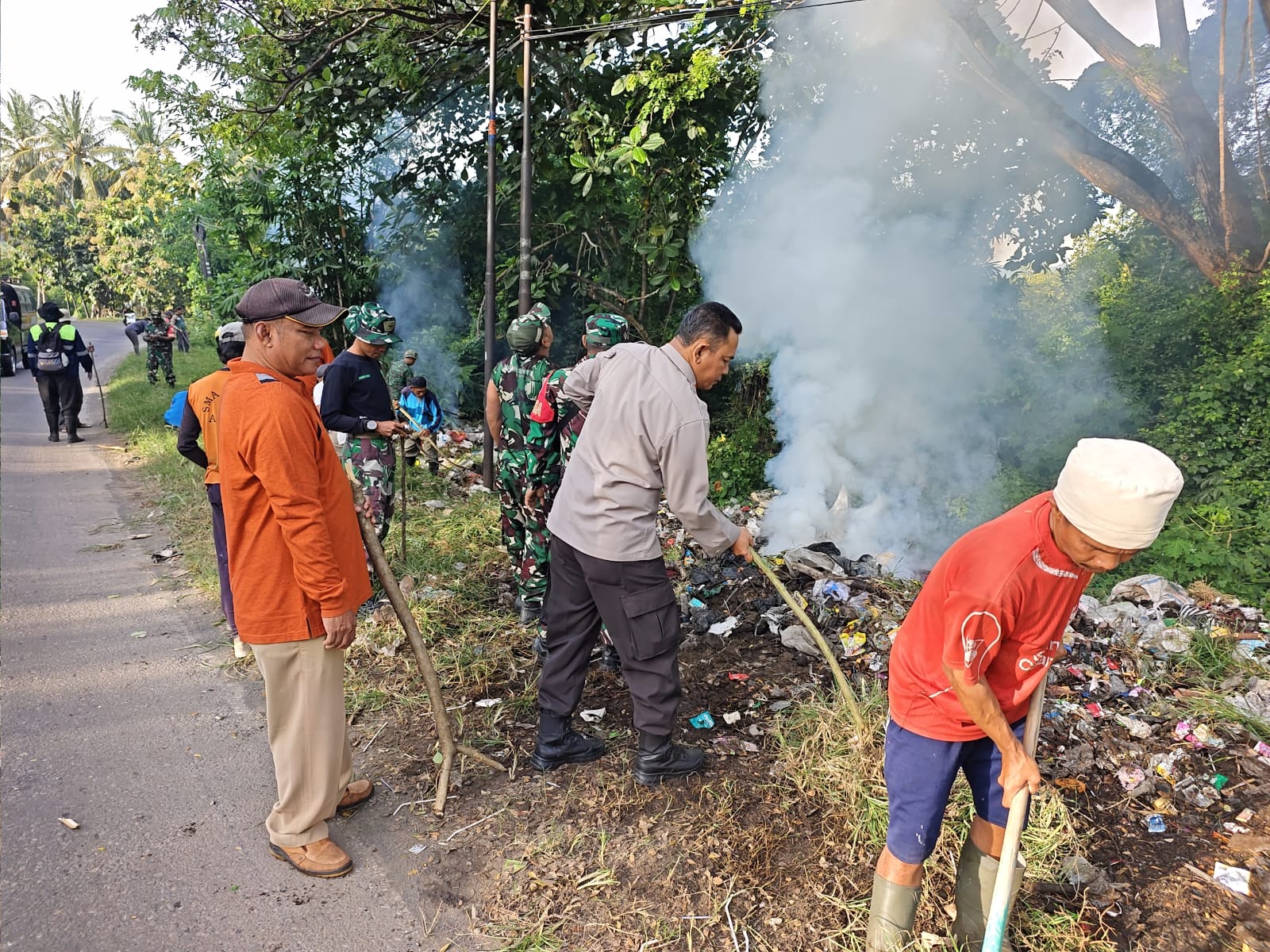 Sumbawa Besar-NTB, Personel Kepolisian Sektor (Polsek) Alas bahu-membahu bersama Personel Koramil Alas, Instansi terkait dan masyarakat melaksanakan kegiatan gotong royong membersihkan lingkungan di sepanjang jalan lintas Tano Sumbawa, Desa Labuhan Alas, Kecamatan Alas.