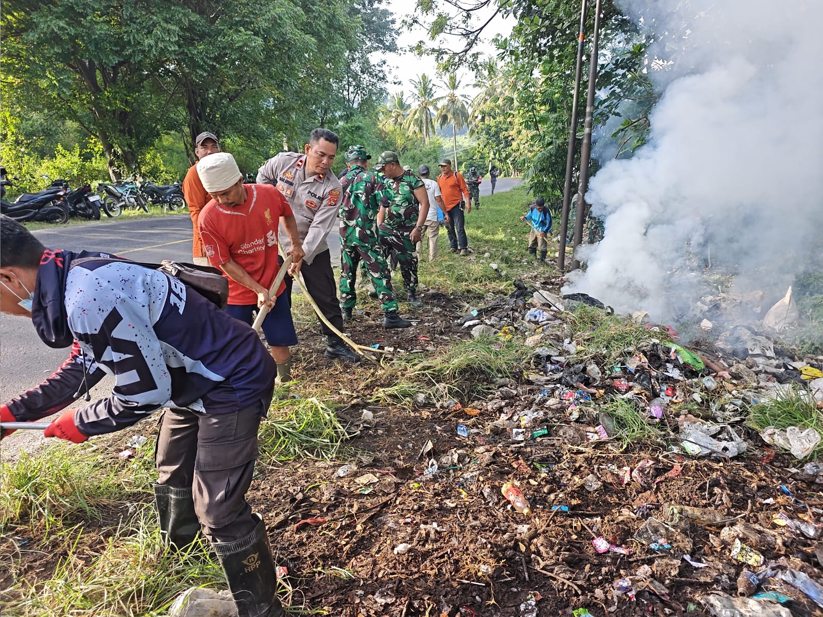 Sumbawa Besar-NTB, Personel Kepolisian Sektor (Polsek) Alas bahu-membahu bersama Personel Koramil Alas, Instansi terkait dan masyarakat melaksanakan kegiatan gotong royong membersihkan lingkungan di sepanjang jalan lintas Tano Sumbawa, Desa Labuhan Alas, Kecamatan Alas.