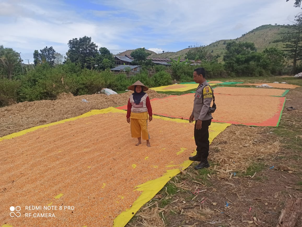 Dalam rangka menyukseskan Program Ketahanan Pangan Nasional Menuju Indonesia Emas, Bhabinkamtibmas Desa Jambu Polsek Pajo, AIPDA Roni Febriadi, turun langsung memantau kegiatan penjemuran jagung milik salah satu warga, Rahmah, di So Foo Mpoa, Dusun Sanggalari, Desa Jambu, Kecamatan Pajo, Kabupaten Dompu, Rabu (23/4/2025).