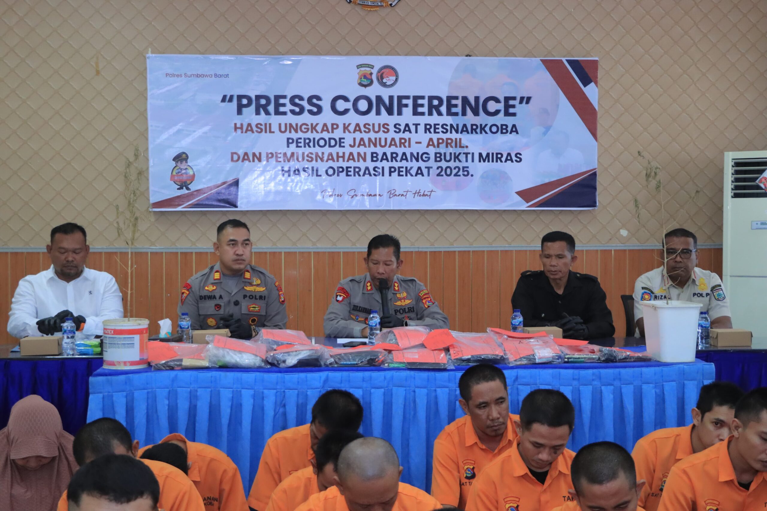 Dalam konferensi pers tersebut, AKBP Zulkarnain menyampaikan bahwa sejak bulan Januari hingga April 2025, Polres Sumbawa Barat berhasil mengungkap 20 kasus tindak pidana narkotika, dengan jumlah tersangka sebanyak 24 orang (laki-laki 23 orang dan perempuan 1 orang). Jumlah barang bukti yang disita secara keseluruhan yakni 224,45 gram sabu-sabu dan 2 pohon ganja.