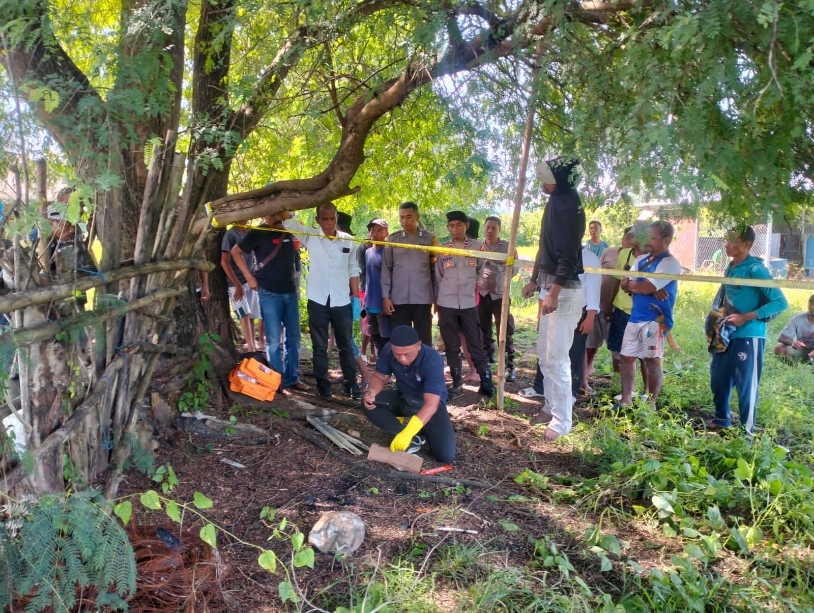 Pada hari Senin, 28 April 2025 pukul 11.30 Wita, telah ditemukan sesosok mayat berjenis kelamin laki-laki berinisial H (39) dalam posisi tergantung dengan seutas tali nilon di pohon asam.