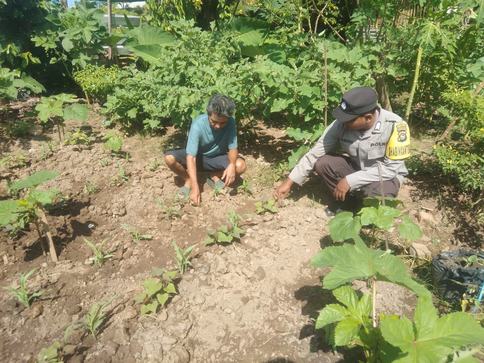 Bhabinkamtibmas Desa Bukit Damai hadir langsung mendampingi warga dalam melihat perkembangan tanaman, memberikan edukasi tentang pola tanam yang tepat, serta mendorong warga untuk lebih aktif memanfaatkan lahan kosong di sekitar rumah.