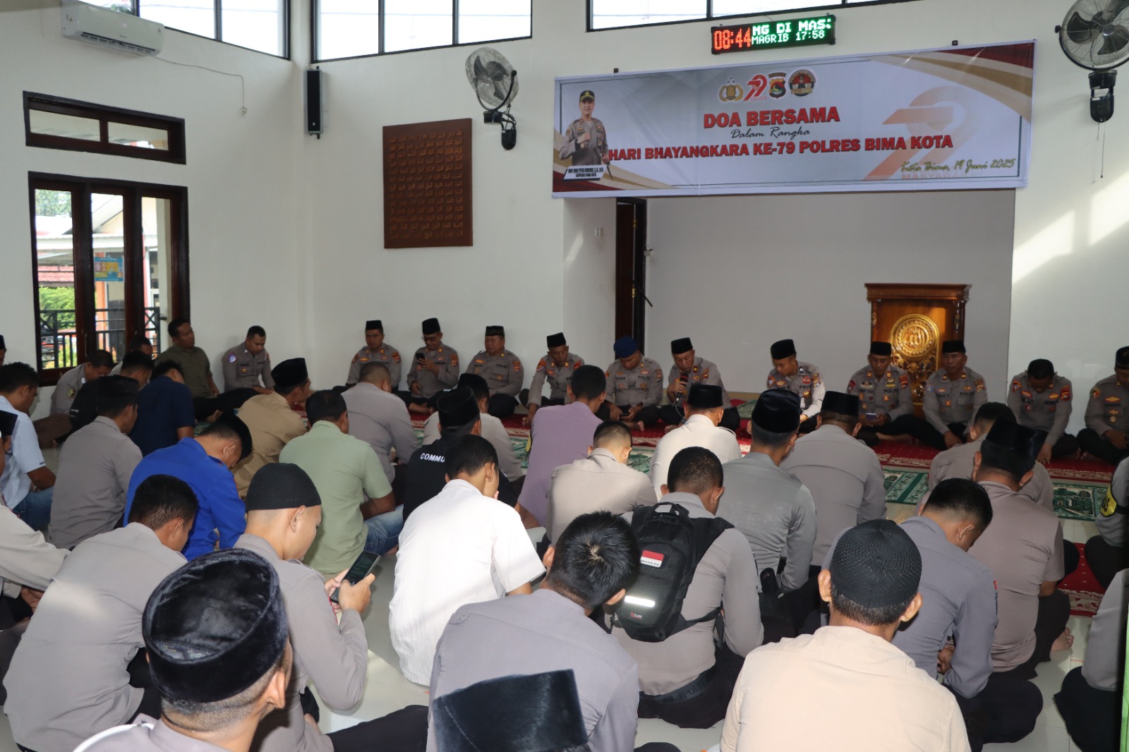 Kota Bima, NTB (19 Juni 2025) – Dalam rangka memperingati Hari Bhayangkara ke-79 tahun 2025, Polres Bima Kota menggelar kegiatan doa dan dzikir bersama yang dilaksanakan secara khidmat di Masjid Al-Jabal Qubis Mapolres Bima Kota, Kamis (19/6/2025).