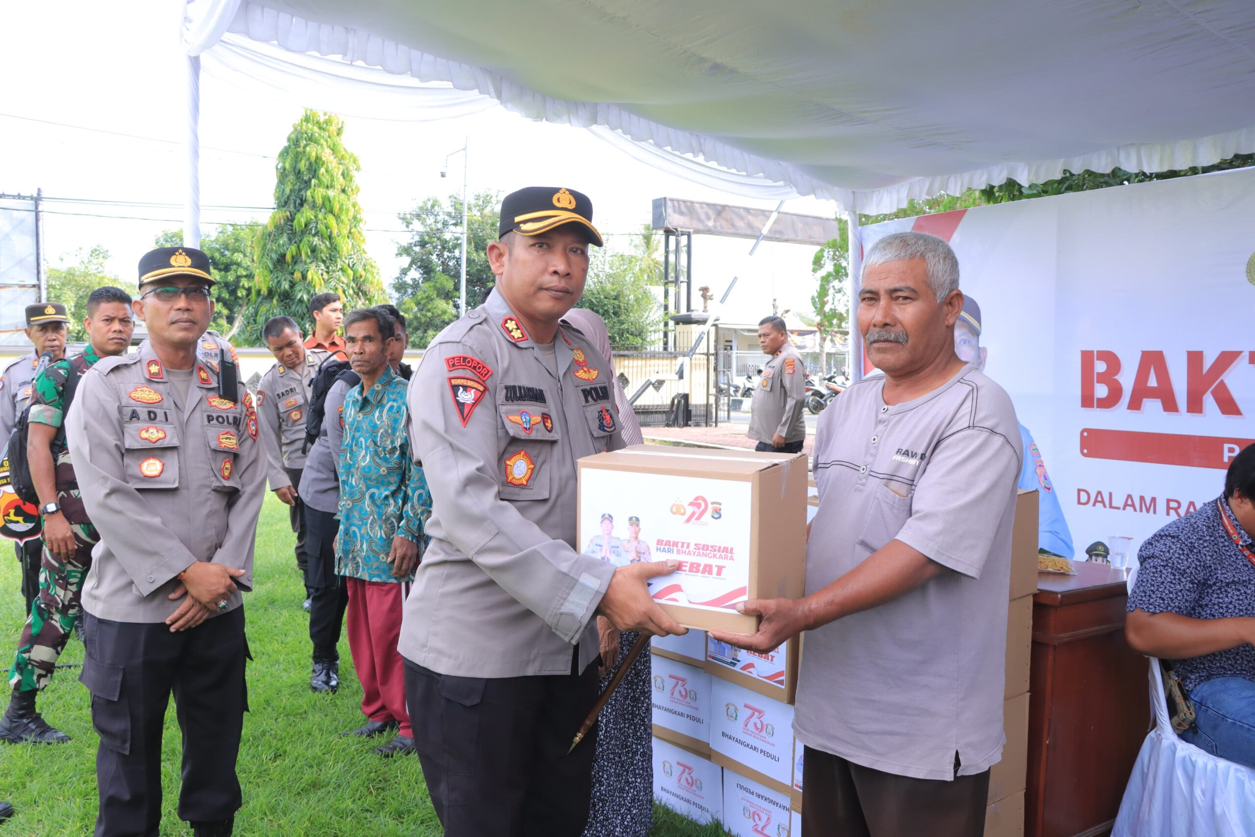 Kegiatan Bakti Sosial diisi dengan penyerahan bingkisan sembako kepada ratusan masyarakat yang hadir. Penyerahan dilakukan secara simbolis oleh Kapolres, Ketua Bhayangkari, dan Dandim 1628/Sumbawa Barat sebagai bentuk kepedulian serta wujud nyata sinergitas TNI-Polri dalam mendukung kesejahteraan masyarakat.