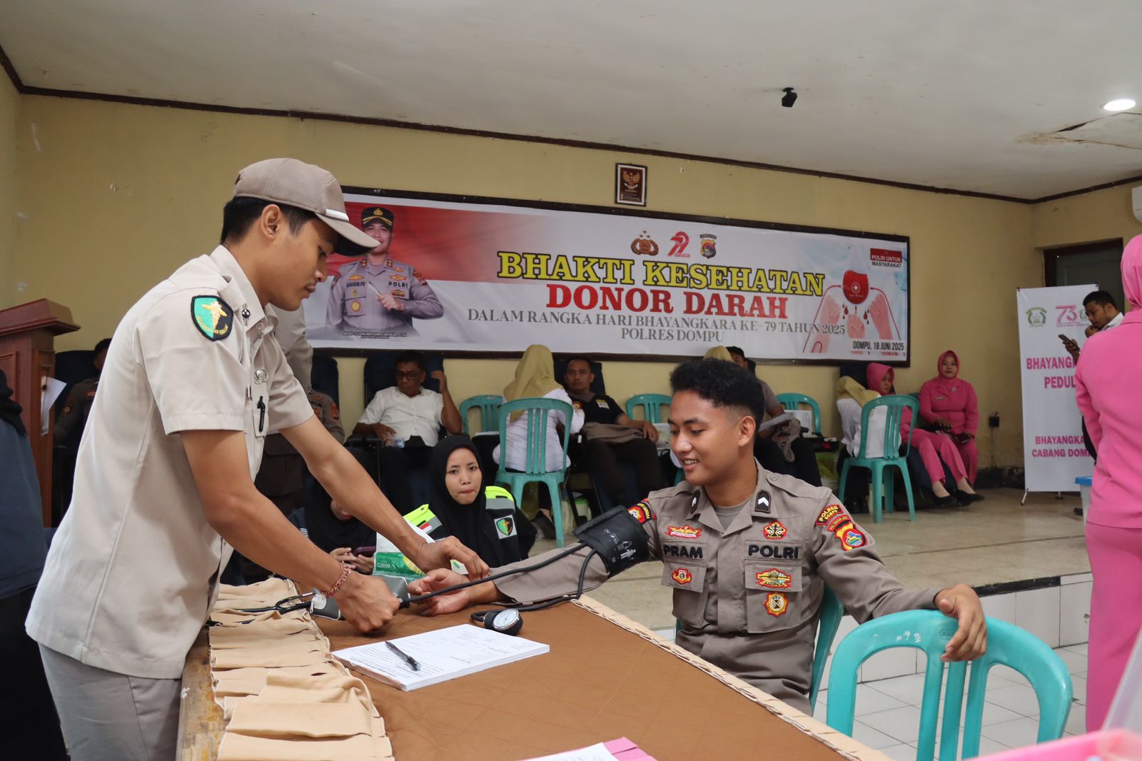 NTB Dalam rangka menyambut Hari Bhayangkara ke-79, Polres Dompu menggelar kegiatan Bhakti Kesehatan Donor Darah yang berlangsung pada Kamis, 18 Juni 2025, pukul 08.00 WITA, bertempat di Aula Polres Dompu. Kegiatan ini diikuti secara antusias oleh personel Polres Dompu beserta para anggota Bhayangkari.