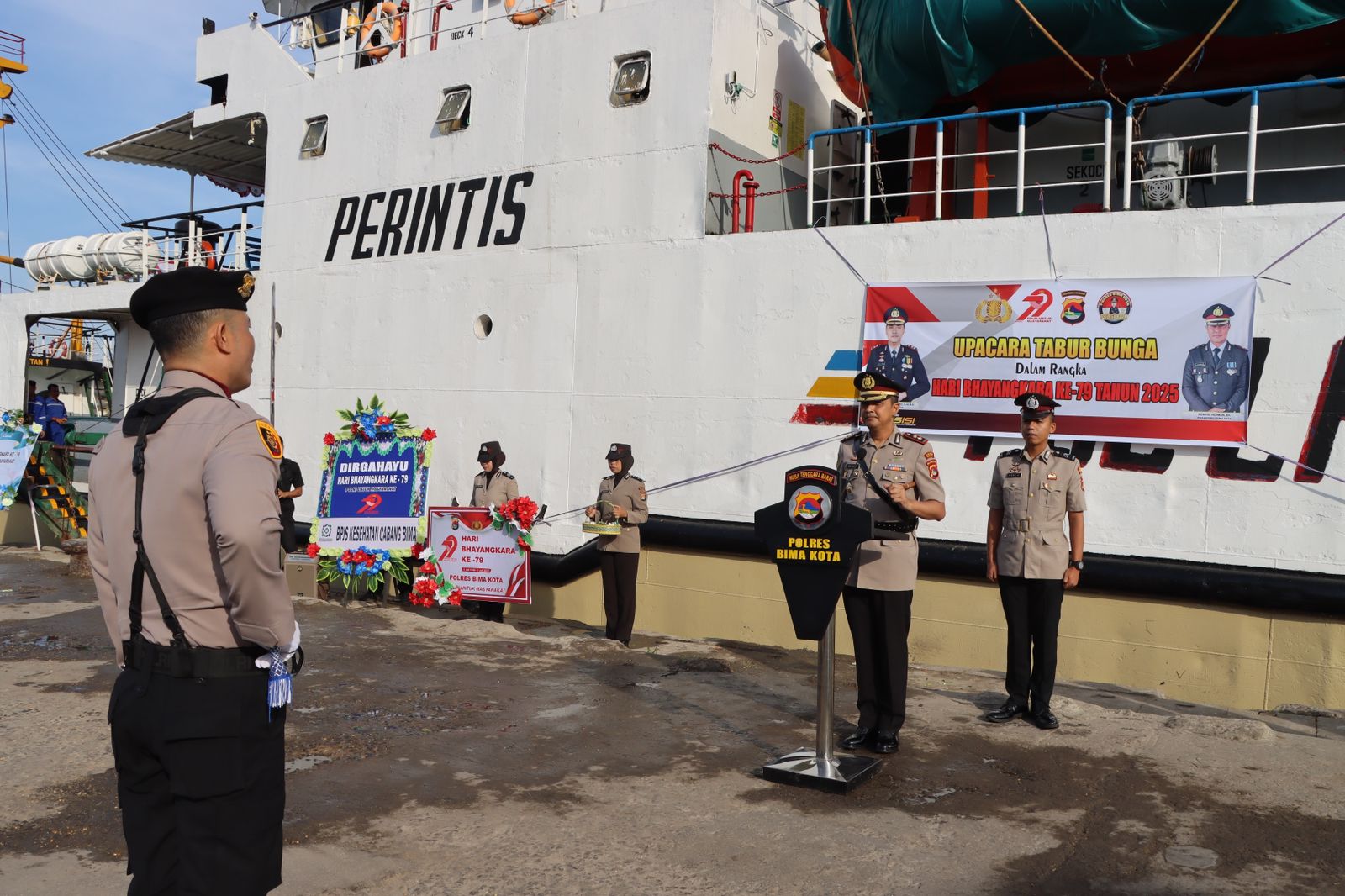 Kota Bima, NTB (27 Juni 2025) – Dalam rangka memperingati Hari Bhayangkara ke-79, Polres Bima Kota menggelar upacara tabur bunga di Dermaga Pelabuhan Laut Bima pada Jumat (27/6/2025) pukul 08.00 WITA. Kegiatan penuh khidmat ini dipimpin langsung oleh Kapolres Bima Kota, AKBP Didik Putra Kuncoro, S.I.K., M.Si., sebagai bentuk penghormatan kepada para pahlawan yang telah gugur dalam tugas.
