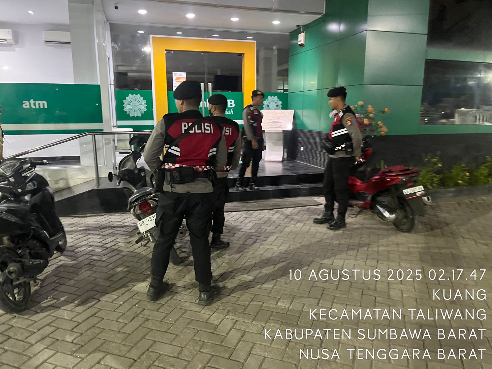 Sumbawa Barat, NTB – Dalam rangka menjaga keamanan dan ketertiban di wilayah hukum Polres Sumbawa Barat, Satuan Samapta melaksanakan patroli dialogis dengan sasaran obyek vital (Obvit) pada Minggu (10/8/2025) sekitar pukul 02.00 WITA. Kegiatan patroli dilakukan menggunakan kendaraan patroli roda empat dengan lokasi sasaran Bank NTB, Kelurahan Kuang, Kecamatan Taliwang, Kabupaten Sumbawa Barat.