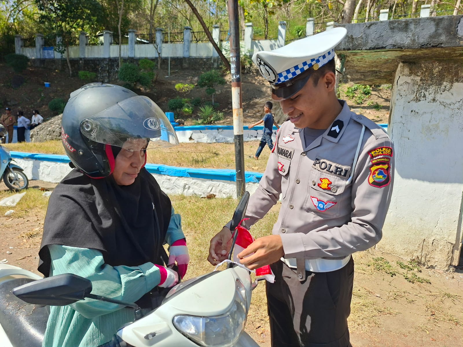 Kota Bima, NTB (11 Agustus 2025) – Dalam rangka menyambut Hari Ulang Tahun (HUT) ke-80 Kemerdekaan Republik Indonesia, Sat Lantas Polres Bima Kota menggelar Aksi Gerakan Polantas Menyapa melalui kegiatan pembagian dan pemasangan Bendera Merah Putih pada kendaraan roda dua (R2) dan roda empat (R4). Kegiatan ini berlangsung pada Senin pagi, 11 Agustus 2025, pukul 08.00 WITA di Jalan Soekarno-Hatta, Kelurahan Monggonao, Kecamatan Mpunda, Kota Bima.