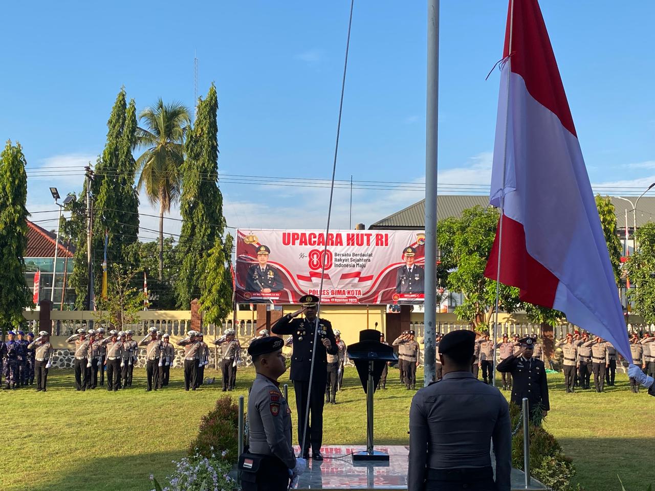 Kota Bima, NTB (17 Agustus 2025) – Dalam rangka memperingati Hari Kemerdekaan Republik Indonesia ke-80, Polres Bima Kota menggelar upacara pengibaran bendera Merah Putih di halaman Mapolres Bima Kota, Minggu (17/8/2025) pagi.