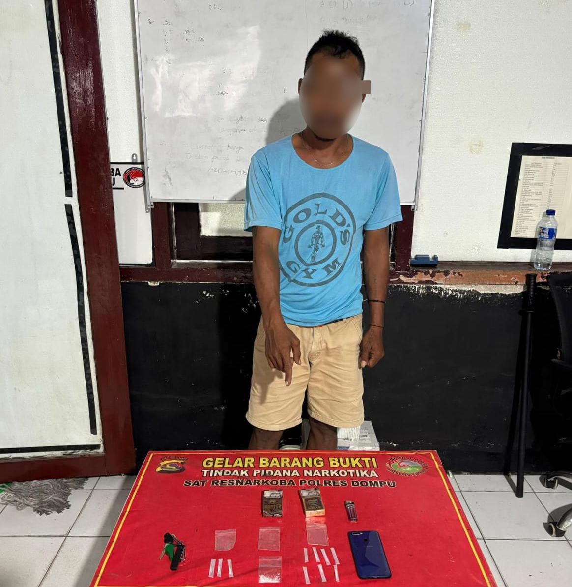 Upaya pemberantasan peredaran narkotika oleh jajaran Kepolisian Resor (Polres) Dompu kembali membuahkan hasil. Tim Opsnal Satresnarkoba Polres Dompu berhasil mengamankan seorang pria berinisial A (34), warga Kelurahan Potu, Kecamatan Dompu, yang diduga kuat sebagai pelaku tindak pidana peredaran narkotika jenis sabu.
