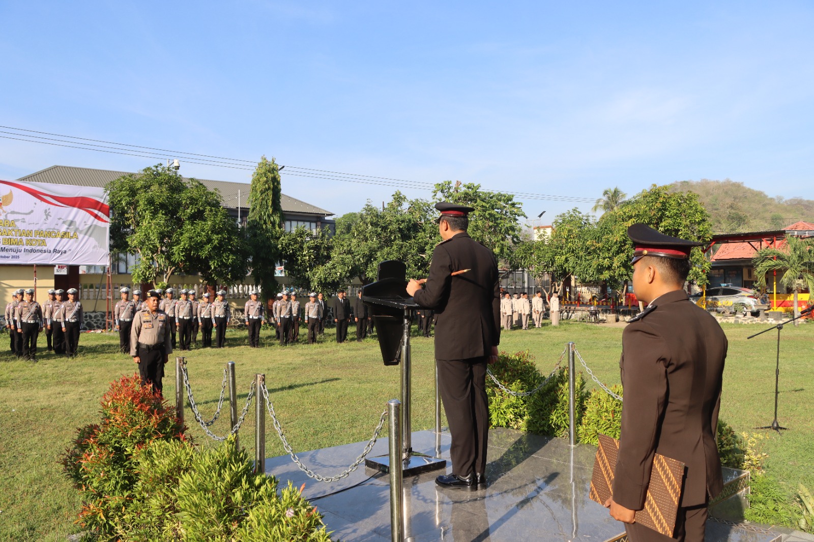 Kapolres Bima Kota dalam amanatnya menegaskan pentingnya momentum Hari Kesaktian Pancasila untuk menumbuhkan kembali semangat nasionalisme dan menguatkan nilai-nilai Pancasila sebagai ideologi bangsa.